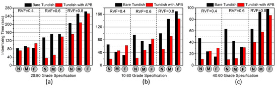 Three kinds of grade specifications (stringent-stringent 20:80, stringent-lenient 10:60 and lenient-lenient 40:60) has been taken to analyze the mixing behavior in the tundish. Figure 8 shows the intermixing time for three grade specification for each outlet of the tundish. It can be seen that near outlet has minimum and far outlet has maximum grade intermixing time. It is also observed that the use of APB has considerably decreased the intermixed grade steel at each outlet when the residual volume of tundish is above 0.4. Further, the use of APB has minimized the grade mixing time, as compared to the cases of inflow rate variation.