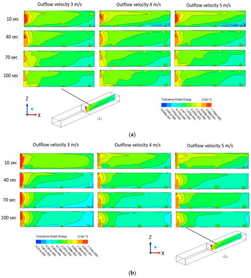 Turbulent kinetic energy contours are shown on middle plane of (a) bare tundish, and (b) tundish having APB.