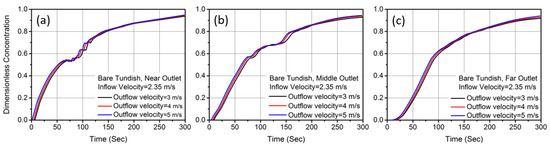 F-curves by varying outflow rate of bare tundish: (a) near outlet, (b) middle outlet, and (c) far outlet.