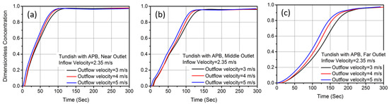F-curves by varying outflow rate of tundish with APB: (a) near outlet, (b) middle outlet, and (c) far outlet.