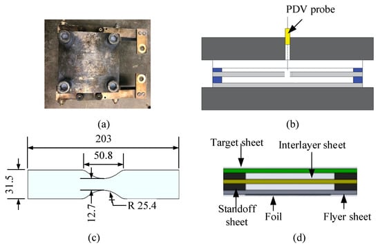 (a) actual implementation of the vaporizing foil actuator welding (VFAW) apparatus; (b) impact velocity test apparatus; (c) sketch of the aluminium foil; (d) schematic of the VFAW process.