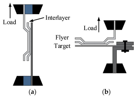 Lap-shear and peel tests were used to analyze the joint strength. A schematic of the strength testing is shown in Figure 2. Three samples from each input energy were tested. For peel testing, the flyer sheets were bent to 90° with respect to the interlayer and target, and the target sheets were fixed to a steel die by a bolt. Testing was carried out using an MTS810 mechanical testing frame at a constant extension rate of 0.1 mm/s.