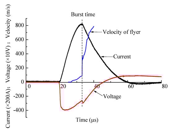 The temporal evolutions of current, voltage, and velocity of the flyer sheet with 8 kJ energy input in VFAW process are shown in Figure 3.