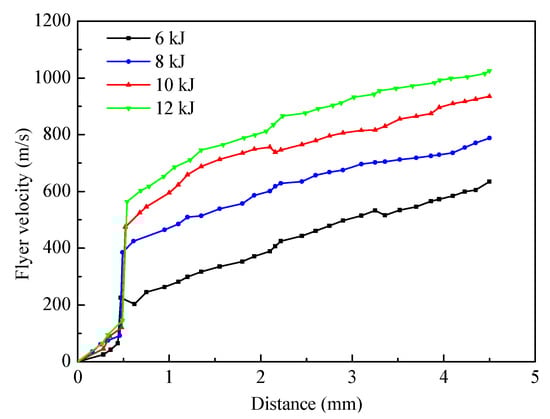 The flyer sheet has a low acceleration (from 25 to 33 μs) under the electromagnetic interaction force generated by the current carrying foil [30]. The voltage has a sharp spike rise and a sudden decrease of current, while the flyer sheet accelerated to 393 m/s instant at about 33.5 μs. This moment also called burst time in the VFAW process. This voltage spike rise is a typical phenomenon in foil vaporized process due to the resistance increase when the foil is vaporized and converted into high pressure plasma. The flyer and interlayer sheet impacted at the target sheet at a velocity of 788 m/s. The velocity trace of flyer sheet with other three energies input are shown in Figure 4. The impact velocities were 635 m/s, 788 m/, 935 m/s, and 1025 m/s for input energies of 6 kJ, 8 kJ, 10 kJ, and 12 kJ, respectively.