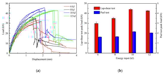 Lap-shear and peel test results at 6 kJ, 8 kJ, 10 kJ, and 12 kJ energies input. (a) Load–displacement curves of lap-shear test; (b) Lap-shear and peel average load.
