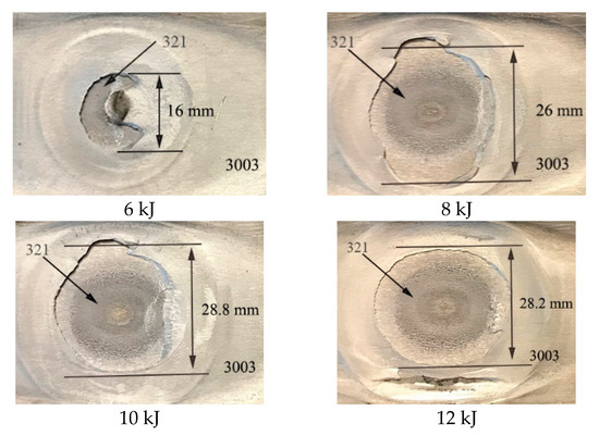 Lap-shear tested samples failed area at 6 kJ, 8 kJ, 10 kJ, and 12 kJ input energies.