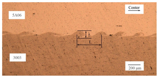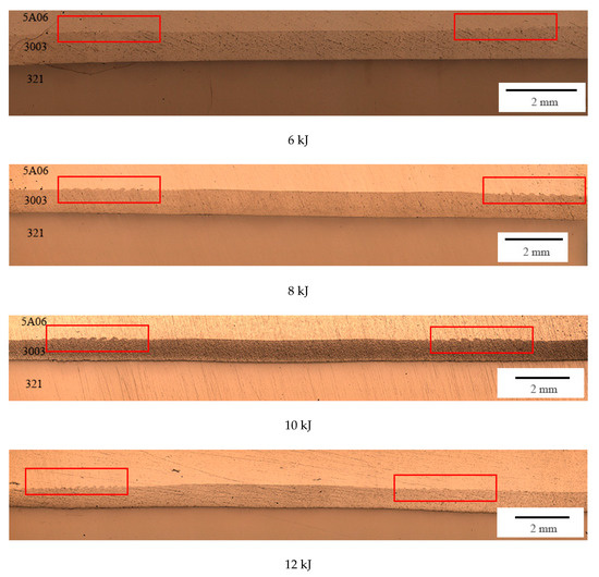 The interface between 3003 and 5A06 is dominated by a wave-like bond, whereas AA3003 and SS321 are bonded with IMC possibly caused by element diffusion and mixing. The wavy-bonding regions with the input energy of 6, 8, 10, and 12 kJ are shown in the red frame of Figure 7. A symmetrically distributed wavy-bonding region is formed at the Al–Al interface area at approximately 5 mm from the central area. The metals of the interlayer and the flyer plate are embedded with each other, the crest height gradually increases from the center to the sides, and the distance between the wavy bonding region and the center decreases with increasing energy. When the input energy increases, the tendency of the crest tilting towards the center increases.