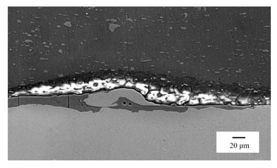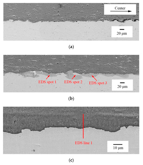 The interface morphologies of the center area with 12 kJ energy input is shown in Figure 11. At high impact velocities and low impact angles, overheated regions were formed at the center of the interface between the interlayer and target at the input energy level of 12 kJ causing damage on the interlayer, and therefore the bonding strength was impaired, with the tensile load decreased to 42.6 kN.