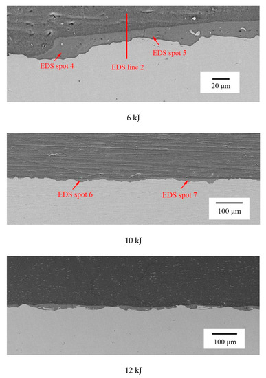 The morphologies of the IMC bonding area at energies input 6, 10, and 12 kJ are shown in Figure 10. The length and thickness of the IMC bonding zone at the interface increases and decreases with the input energy, respectively. When the input energy is 6 kJ, the largest thickness of IMC at 50 μm is achieved, whereas its length is approximately 300 μm. When the input energy increases to 10 kJ, the thickness of the interface is reduced to 30 μm, and the IMC is discontinuously distributed with approximately 2 mm in length. The thickness of IMC reduced to 26 μm with energy input increased to 12 kJ.