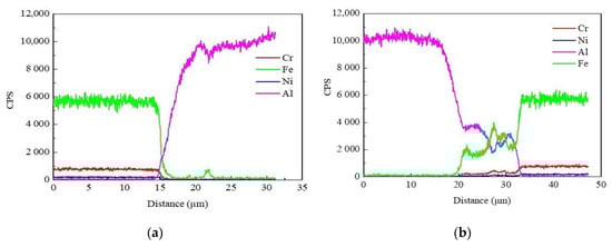 The element line scanning results at the interface between aluminium alloy 3003 and stainless steel 321 are given in Figure 12. The welded areas at the interface between aluminium alloy 3003 and stainless steel 321 and at the central area close to the joint are mainly characterized by IMC. Within a certain distance from the center of the joint, the collision angle between the interlayer and target plate increases. At the interface, a 3 μm thick bonding region is formed. The intensity is significantly larger than that in the central area. The EDS scan results of Points 1–7 are shown in Table 3. The IMCs along the interface between aluminium alloy 3003 and stainless steel 321 are FeAl and FeAl3.