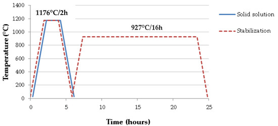 Two heat treatments were realized, one solution treatment performed by heating with 10 °C per min rate until 1176 °C for 2 h followed by air cooling. The second treatment, stabilization heat treatment, was realized in samples that were already solid solution heat treated and it consists of heating with 10 °C per min rate until 927 °C for 16 h followed by air cooling. The heat treatment routes are shown in Figure 1.