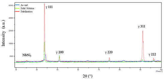 As such, the stabilization heat treated condition foments the γ-phase with the lattice parameters [111] and [311]. The solid solution heat treated condition foments the same lattice parameters, but with less intensity. The small peak at 35.5° found in the stabilization heat treated condition is the carbide NbNi3.