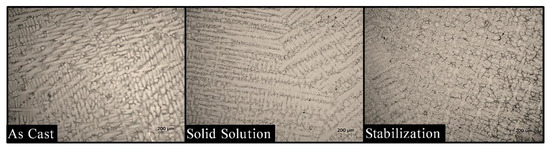 In Figure 3, it is possible to observe the elongation of the dendrites as a consequence of the casting process, but there is no difference in the microstructure after the heat treatments.