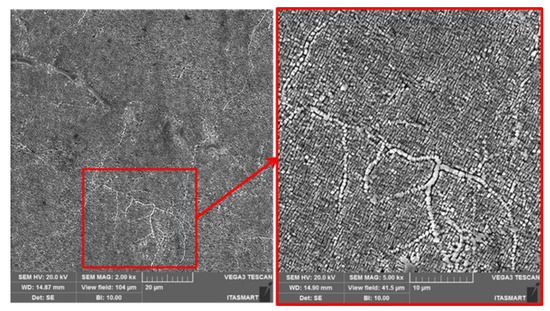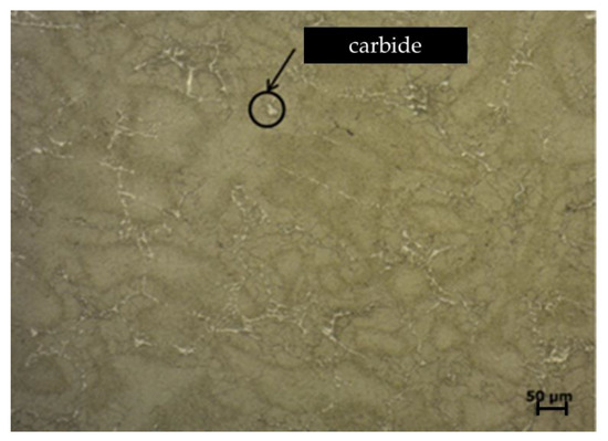 The microstructure with interdendritic precipitation of carbides (light phase) is highlighted in Figure 4.