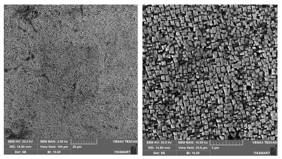 The analyses of the Inconel 713C microstructure after the heat treatments were carried out in the cross sections of the specimens by optical microscopy. The samples were cut, mechanically polished and electrochemically etched—3% sulfuric acid at 3 V for 5–10 s. A Zeiss Axio Imager Scope A1 microscope (Carl Zeiss, Munich, Germany) was used for microstructure visualization. The scanning electron microscope (SEM) (Tescan, Kohoutovice, Czech Republic) coupled with a Tescan Vega 3 XMU with Energy-dispersive X-ray spectroscopy (EDS) (Tescan, Kohoutovice, Czech Republic).