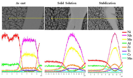 With the heat treatments, the niobium concentration reduced in the matrix phase. With the treatment of stabilization heat treated, there is a higher concentration of niobium in the carbides, increasing its concentration in relation to the others, such as molybdenum, zirconium, and titanium.
