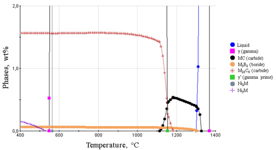 The simulation results of the percentage weight of each phase as a function of temperature are shown in Figure 8 and Figure 9. Figure 8 shows the major phases and the Figure 9, the minority phases. The liquidus and solidus temperatures are 1350 and 1280 °C, respectively, indicating a solidification range of 70 °C. The first phase to solidify from the liquid is the matrix phase γ, the first carbides, MC-type, started to segregate around 1360 °C, with the ending of the liquid phase solidification, both phases coexist at the end of solidification, forming a microstructure γ plus MC-type carbides in this range of temperature. The Ti, Nb, and Cr present in the alloy are carbide-forming elements.