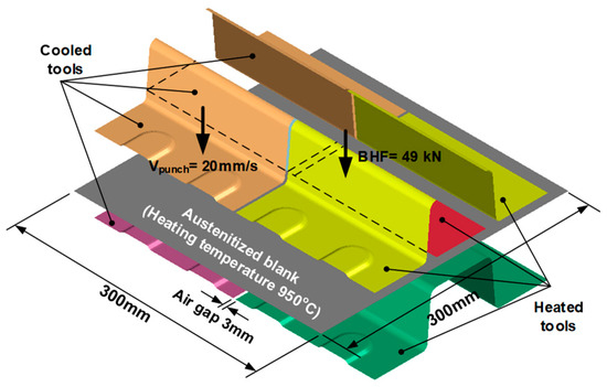In this study, the hat-shaped model was employed to predict hardness of the partially quenched part as shown in Figure 3. The shape of the initial blank for the hat-shaped model was square sheet (L 300 mm × W 300 mm) with the thicknesses of 1.4 mm and the air gap of 3 mm was applied to prevent heat transfer between heated and cooled tools. Also, range of temperature for heated tools was from 350 to 500 °C and quenching time was from 10 to 20 s to evaluate the effect of tool temperature and quenching time on the hardness of partially quenched part. The conditions of FE simulation and thermal properties for tools are summarized in Table 3. The properties of blank, including Young’s modulus (E), Poisson’s ratio (ν), conductivity (K) and specific heat were also considered in FE simulation as shown in Table 4.