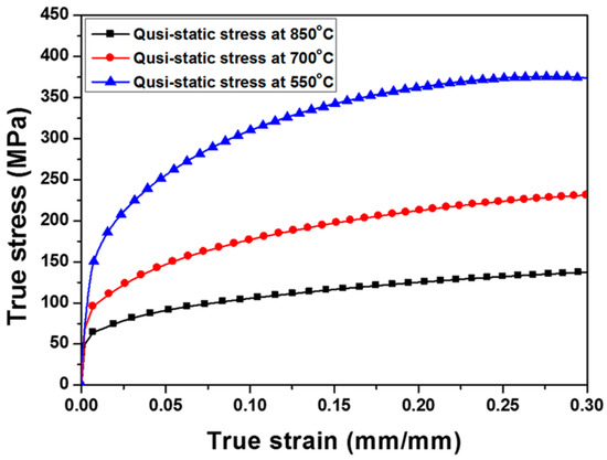 The strain-stress curve at quasi-static state for boron steel with various temperatures.