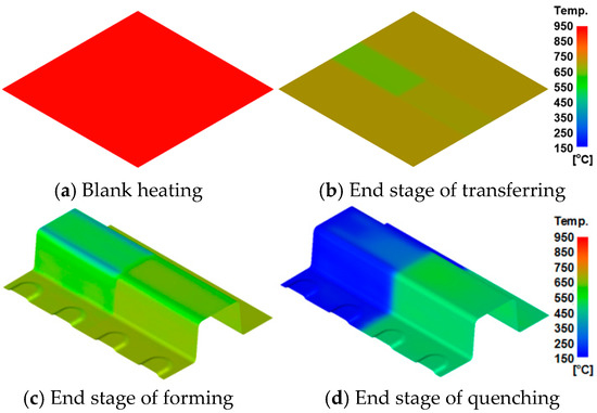 Figure 5 representatively shows the results of FE simulation for the temperature distributions of each process at heated tool temperature of 400 °C and quenching time of 10 s. The austenitizing condition adopted in this study provided a uniform temperature distribution throughout the blank as shown in Figure 6a and the austenitized blank after transferring was formed at approximately 730~750 °C. In the results for the forming process, temperature distribution at the top side was lower than those for the other regions because it was first pressed and contacted with holder. After quenching process, temperature for a part of blank referred to as low strength region which was contacted with heated tools was approximately 400 °C as shown in Figure 5d.