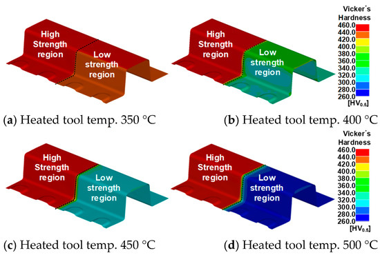 It is generally known that a low cooling rate during quenching process decreases the hardness and mechanical properties of boron steel. Figure 6 illustrates the predicted hardness distributions of the partially quenched part by FE simulation coupled with the QFA for various heated tool temperatures for quenching time of 10 s. The predicted hardness for low strength region was the range from 430 to 280 HV0.5 in accordance with temperature rise of heated tool, whereas the value for high strength region was from 450 to 470 HV0.5 because the cooled tool temperature was fixed as 20 °C.
