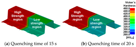 Figure 7 shows the predicted hardness distributions of the partially quenched part for different quenching times, such as 15 and 20 s for heated tool temperature of 400 °C. The predicted hardness for low strength region was decreased from 345 to 325 HV0.5 as the increase of quenching time.