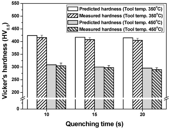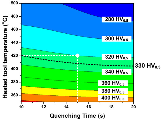 Effectiveness of process window for hardness prediction was verified through experiment of tailored tool thermomechanical treatment. The process window could also be used to determine the process parameters. When the target hardness of partially quenched part is 330 HV0.5, black dotted line in Figure 8 represents the combination of process parameters for achievement of required mechanical properties. In this case, a quenching time of 10 s and a heated tool temperature of 420 °C is the most effective conditions in terms of high productivity. Also, when the target hardness is 320 HV0.5 and quenching time is fixed for 15 s in process of mass production, the heated tool temperature could be determined by 420 °C on the basis of white dotted line in Figure 8.