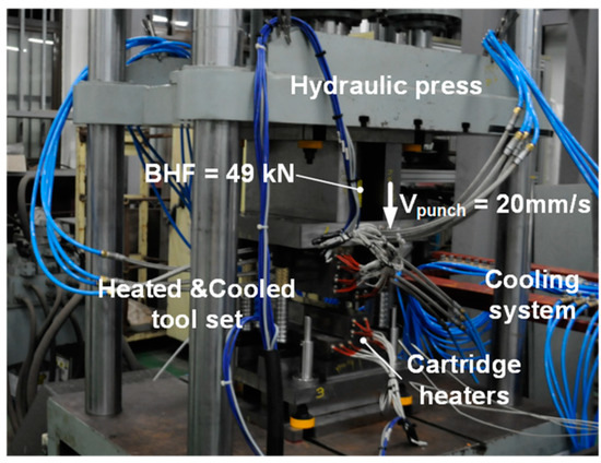 Figure 9 shows the experimental setup for the hat-shaped part. Tools were composed of punch, holder and die which were made of AISI-H11 steel. In order to obtain the tailored property of part, tools for low strength region were heated by cartridge heaters. In the opposite region, cooling channels were used to rapid cooling of blank to obtain the high strength property. In addition, air gap between heated and cooled tools was 3 mm for the adequate insulation. Blank holding force of 49 kN was imposed by four gas springs and punch speed was fixed to 20 mm/s with total distance of 120 mm. In the experiment, the blank was austenitized at 950 °C for 5 min in the electric furnace and then it was manually transferred to the tool within 7 s. The temperature of tools was 350 °C and the quenching time was 10, 15 and 20 s.