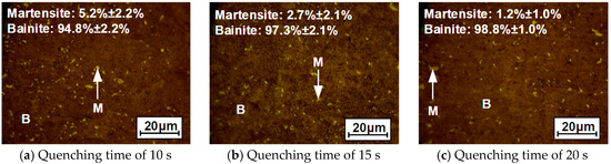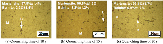 In order to investigate and measure the volume fraction of each phase in a hot-stamped part, metallographic analysis was performed at measurement point for hardness with LePera etching [20]. The etched specimens were observed using an optical microscope with Image-Pro Plus 7.0 image analysis software (Media Cybernetics, Rockville, MD, USA). The software was used to calculate volume fraction considering different color for each phase, such as white (martensite), brown (bainite) and black (carbide). Figure 12 and Figure 13 show the microstructure of partially quenched part at tool temperature of 350 °C and 450 °C, respectively. In the case of quenching time of 10 s at tool temperature 450 °C, volume fraction of bainite was 94.8%, whereas it was increased to 98.8% at quenching time of 20 s. However, the volume fraction of bainite was less than 10% in case of tool temperature 350 °C.