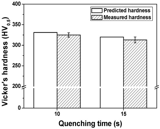 Comparison between predicted and measured hardness at heated tool temperature of 420 °C and quenching time of 10 s and 15 s.