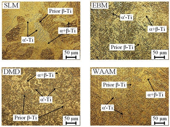 The representative microstructures of the 3D printed titanium samples, fabricated using four different AM processes, are shown in Figure 3. It was noticed that all the samples consisted of α′-Ti martensitic phase along with α+β-Ti matrix and prior β-Ti grain boundaries. However, the morphology of the α′-Ti martensite phase was slightly different, depending upon the AM process. The SLMed sample consisted of fine martensitic laths resembling a needle-like shape. The EBMed sample consisted of a similar type of fine martensitic laths, as that of the SLMed sample, but these laths were short and less in quantity. On the other hand, the DMDed sample consisted of thick and short martensitic laths with distinct prior β-Ti grain boundaries. The WAAMed sample consisted of a longer prior β-Ti grain boundary.