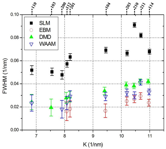 The Williamson-Hall (WH) plot is shown in Figure 4, and the quantitative results obtained using eCMWP are presented in Table 1. From both the WH plot and the eCMWP data, it can be observed that the SLMed sample consisted of the highest dislocation density, whereas the EBMed sample had the lowest dislocation density in comparison to the DMDed and WAAMed samples, which exhibited similar dislocation densities. In contrast, the FWHM of the different diffraction peaks does not increase monotonously with increasing ’K’, the reciprocal of the lattice spacing. This is due to the well-known effect of strain anisotropy [26], which is an indication of a significant dislocation density present in the material. The mathematical description of strain anisotropy is provided by the dislocation contrast factors, which describe the broadening of a given diffraction peak as a function of the hkl Miller indices and the different dislocation types. The evaluation of the contrast factors is handled internally by the eCMWP line profile analysis software, and the results can be used to determine the ratio of the dislocations densities having <a>, <c+a>, and <c> type Burgers’ vectors [10].