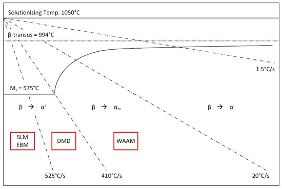 Schematic continuous cooling diagram for Ti-6Al-4V solution treated at 1050 °C for 30 min and quenched using the Jominey end quench test, showing the fit in terms of the cooling rates experienced during the four AM processes. (Reproduced with permission from Ahmed and Rack, Phase transformations during cooling in α+β titanium alloys, published by Elsevier, 1998 [16]).