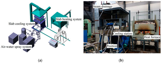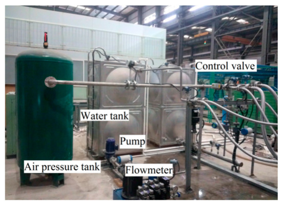 An overview of the system configuration is shown in Figure 1a,b. The experimental setup consisted of an air–water spray, slab heating, slab cooling and data acquisition and analysis systems. To simulate the features of an industrial air mist spray, a laboratory air–water spray system was designed, as shown in Figure 2. The system consisted of water tanks, pumps, an air compressor, an air pressure tank, electromagnetic flowmeters, temperature transmitters, pressure transmitters, electric control valves, metal hoses and spray racks.
