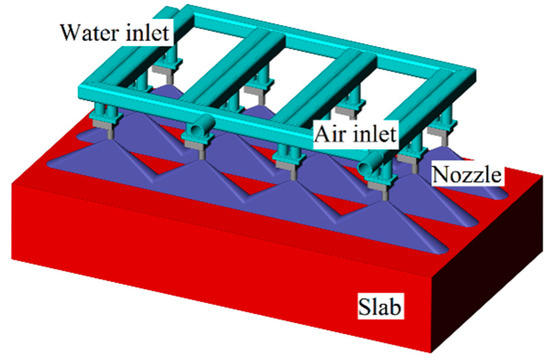 Figure 3 shows the top side cooling device that used three rows and four columns of nozzles with a 120° impingement angle. According to the nozzle angle, the overlap between the two nozzles was designed with nozzle manufacturer’s suggestion. The jets coalesced into a mist curtain on the slab surface.