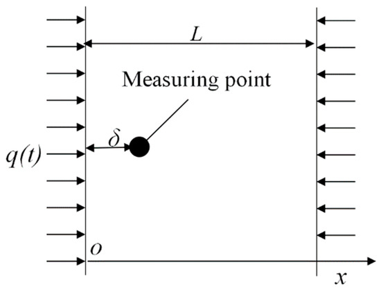 We used thermocouples embedded in the slab at certain depths to measure cooling curves at different positions. The surface temperature and heat flux of the slab were calculated using the Beck’s sequential function specification method [18,19]. As a result of the calculation, the relation between the HTC and the slab surface temperature could be obtained. In this study, we regarded the internal heat transfer in the slab as one-dimensional unsteady heat conduction along the direction of the spray cooling, ignoring the heat loss from the side of the slab. Figure 5 shows the physical model of the inverse heat conduction problem during the cooling.