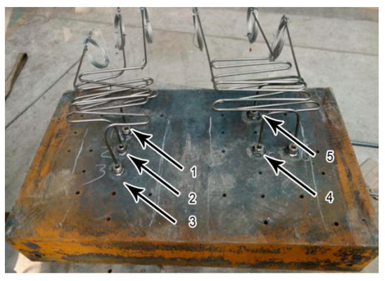 Figure 6 shows the armored K-type thermocouples that were inserted into the holes and “locked” inside by fastening devices. The locations of thermocouples numbered 1 to 5 are also shown in the figure. The thermocouples were far away from the edge of the slab to ensure a reduced heat loss effect. The thermocouple NO.1 and NO.3 were arranged inside the slab under the clamping roller respectively. The NO.2 was in the middle of the two clamping rollers. The slab was tilted 15° from the horizontal position to simulate the slab position.