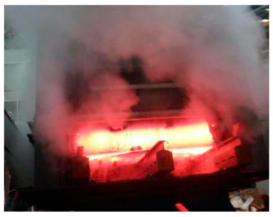 Figure 4 shows the clamping rollers with the top spray configuration. During the tests, the slab surface was exposed to the air mist nozzles through the gap between the rollers. The heat was conducted to the slab surface and removed by the cooling air and water. The cooling process consumed much water and air, and heat was released during the process. Vapor and cooling water were collected and directed into a drain while the apparatus operated.