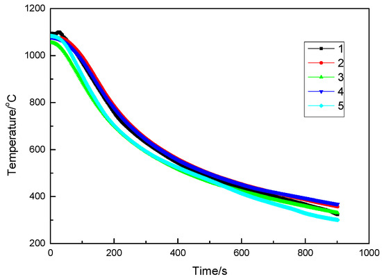 Typical temperature readings relative to time curves during the spray cooling are shown in Figure 8. Regardless of the thermocouple location, the time–temperature curves were similar. A high cooling rate was observed, and the slab temperature dropped drastically. Due to the strong relation between the heat flux and the surface temperature, heat extraction rates changed rapidly with time.