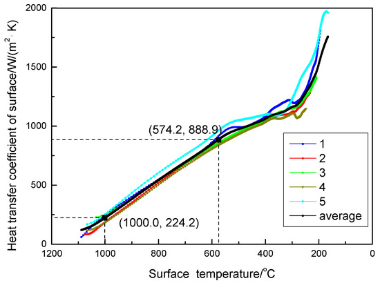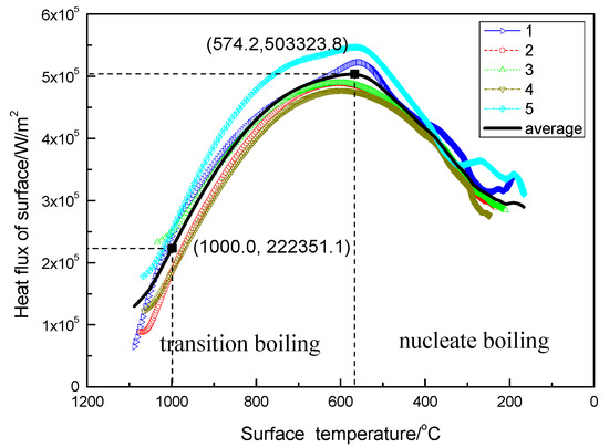 Figure 9 shows the relation between the surface temperature and the heat flux at different measuring positions. It can be seen that the heat flux was not linearly related to the surface temperature. The five thermocouples’ average heat flux of the slab first increased to a maximum value when the slab was cooled to approximately 574.2 °C, and then decreased from the peak value with further cooling. The maximum average heat flux was 5.0 × 105 W/m2 at 572.4 °C. At 1000 °C, the average heat flux was 2.2 × 105 W/m2. In the temperature range from 1100 to 800 °C, the average heat flux was 2.9 × 105 W/m2. Comparing the heat flux at the different thermocouple positions, better vapor discharge conditions resulted in faster cooling and a higher heat flux.