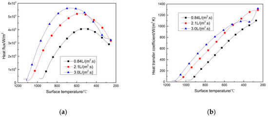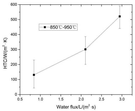 Similar slopes for the transition boiling and nucleate boiling regime were observed for different water fluxes during cooling and shown in Figure 11a. The HTC curve showed a typical linear relation, as shown in Figure 11b. The heat flux with a water flux of 3.0 L/(m2∙s) was higher, especially the CHF. There was a clear trend of increased CHF with water flux. Higher water flux led to more droplets breaking the vapor film and accelerating the steam discharge, strengthening the heat transfer on the slab surface.