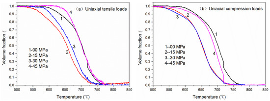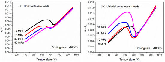 The effects of stress on the ferrite transformation were experimentally investigated. The experimental results are shown in Figure 3 (tensile tests in Figure 3a and compression tests in Figure 3b).