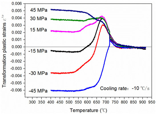 The transformation plastic strain can be obtained from the data using Equation (6), as shown in Figure 5. Qualitatively, it can be observed tensile stresses lead to positive transformation plastic strains and vice versa. In the low stress range (±15 MPa), the tensile stress had a more significant effect on the transformation plasticity, which was three times greater than that of the compressive stress. With the increase of the stress magnitude, the transformation plasticity of the compressive stress gradually exceeded that of the tensile stress. Under a −45 MPa stress, the transformation plasticity of compressive stress was 19% higher than that of the tensile stress.