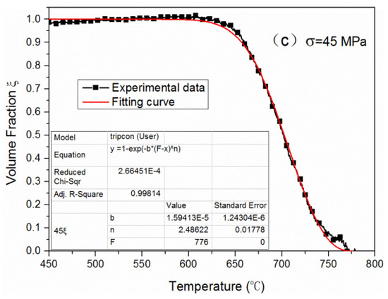 The volume fraction of ferrite transformation was fitted using Equation (14) to obtain n and b values under different loads. The fitting results for 15, 30, and 45 MPa loads are presented in Figure 8a–c and Equations (15)–(17), respectively. This new kinetics equation for ferrite transformation agrees well with the experimental values. Using this model, the volume proportion of the product phase under external stresses in the continuous cooling process can be described accurately.