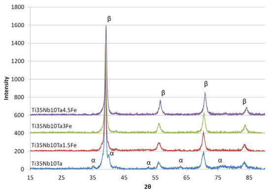 Fe has a critical content for retaining a 100% β-Ti phase. This value is 3.5 wt% in the Ti-Fe alloy system under quenching conditions [11]. Based on the molybdenum equivalent, Fe presents a stronger β-Ti phase stabilization effect [10]. As these low Fe contents more strongly affect β-Ti (bcc) phase stabilization [12], the solubility of Fe in β-Ti (both bcc structures) causes simple solution strengthening, while additions above 2 wt% Fe significantly increase strength [13]. However, the significant biocompatibility of the different alloys containing Fe has been reported in numerous studies and does not sacrifice the biochemical suitability of alloys [13,14,15].