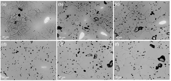 The scanning electron microscopy (SEM) images of the backscattered electron (BSE) signal of (a) Ti35Nb10Ta1.5Fe, (b) Ti35Nb10Ta3Fe (c) Ti35Nb10Ta4.5Fe sintered at 1250 °C and of (d) Ti35Nb10Ta1.5Fe, (e) Ti35Nb10Ta3Fe (f) Ti35Nb10Ta4.5Fe sintered at 1300 °C.