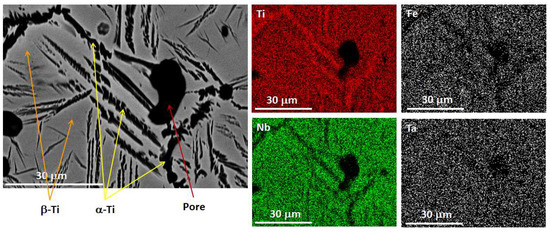 Figure 4 shows the EDX mapping results in the α + β region on the Ti35Nb10Ta1.5Fe sintered at 1250 °C. The α-Ti phase presents a lath morphology, where the amount of Ti identified by EDX mapping was bigger in this area than in the β phase regions. The Nb is concentrated in the β-phase regions, with the low content of niobium in the alpha phase laths. In these α-Ti laths, the amount of Fe and Ta was also lower, although the Ta and Fe distribution presented more homogeneity and the content inside the α-Ti phase slightly decreased. However, this lack of homogeneity may indicate that the microstructure is not in equilibrium due to the lack of diffusion of the refractory elements in the titanium.