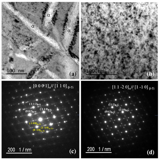 Figure 5 illustrates the TEM images in the bright field (BF) mode for the Ti35Nb10Ta alloy sintered at 1250 °C, where two regions are observed. The β-stabilizer poor region (α + β zone) is shown in Figure 5a and the β-Ti region (β-stabilizer rich) with the nanometric ω phase is illustrated in Figure 5b. The selected area diffraction patterns (SADP) in Figure 5c show the respective orientation relationships between the α/β phases on the zone axis [0001]α//[110]β and in Figure 5d for the orientation relationships between the β/ω phases: [110]ω//[10]β. The main reason why the ω phase was not detected by the XRD analysis was because of a smaller volume fraction, whose small size means it is impossible to be detected by this technique. An isothermal metastable ω phase (hcp) was formed at the slow cooling rate in the furnace after the sintering process. In this case, it was not possible to associate it with an athermal ω phase, which is typical of the water-quenched samples from the β-Ti phase field [19].