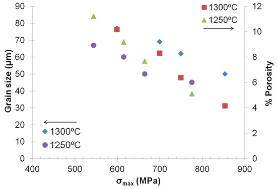 Relationship between flexural strength (σ) with grain size and porosity for 1250 °C and 1300 °C.