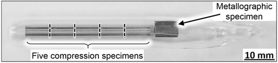 From the swaged rods (diameter: 8.1 mm), 45 compression specimens with dimensions: 4 mm diameter and 8 mm height were machined on a lathe. Afterwards, the faces of the compression specimen were ground using a corundum grinding stone (particle size ~250 µm) to achieve a parallelism better than 1°. As MEAs and HEAs among the Cr-Mn-Fe-Co-Ni system which contain Mn were reported in the literature to easily oxidize in air above 600 °C [24,25,26], all recrystallization heat treatments performed in the present study were carried out in evacuated quartz tubes. Even though Mn has a low vapor pressure, energy-dispersive X-ray spectroscopy (EDX) analyses (not shown here) did not reveal any significant Mn losses after annealing at 1473 K for 1 h. To minimize the potential for scatter, five compression samples and a metallographic specimen were annealed at the same time, see Figure 1, at temperatures between 1073 and 1473 K for times ranging from 45 min to 2 h to establish seven different grain sizes. After the heat treatments, the samples were air-cooled and removed from the quartz tubes. All metallographic samples were embedded in epoxy, ground with SiC abrasive paper down to a grain size of ~7 µm, polished with diamond suspensions to 1 µm, and finally vibropolished for 48 h (Vibromet 2, Buehler, Esslingen, Germany) in colloidal silica having a particle size of 0.06 µm.